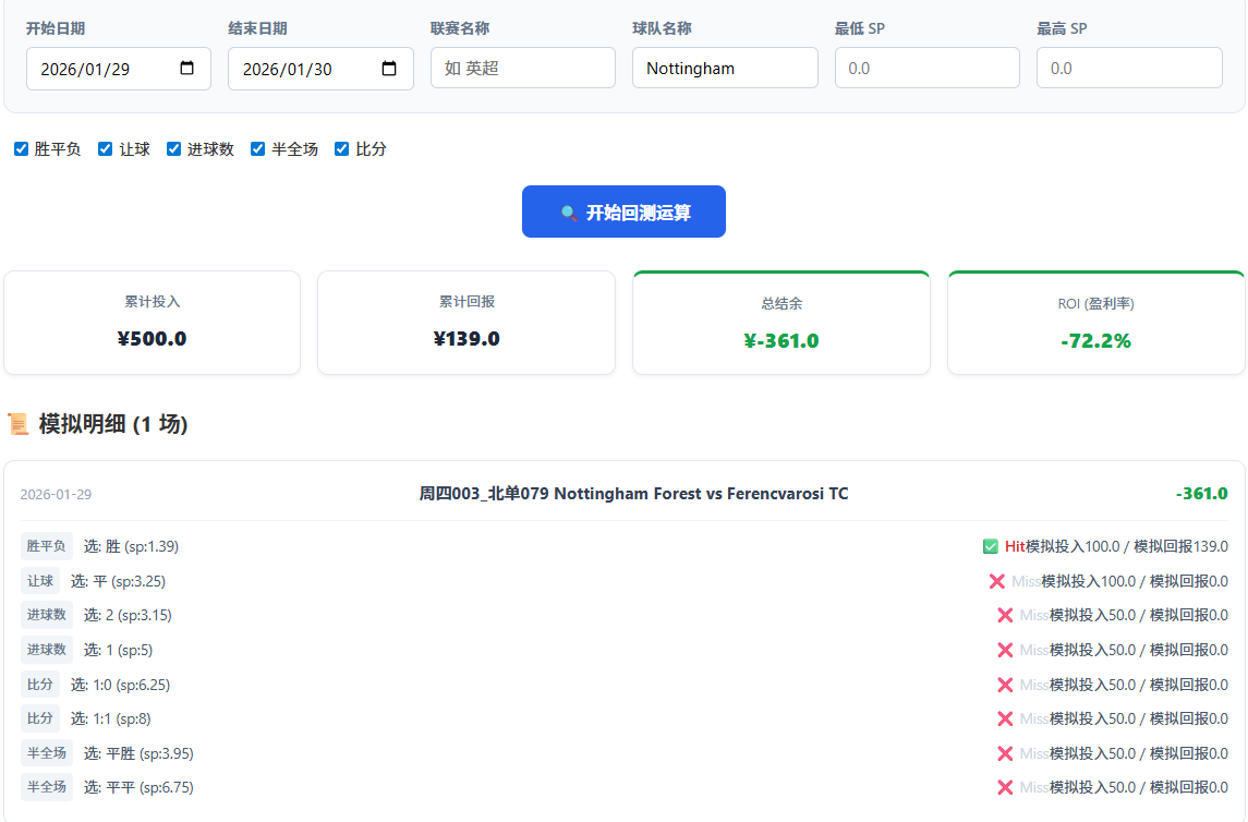 人工回复:这场用于模拟回测功能的非公示数据里,有胜的选项。所以系统自动结算的时候方向是正确的,这种情况很少发生,但需要修改多个地方,暂不准备修改。可使用系统的模拟回测功能指定球队 Nottingham 然后看回测结果查证。顺便发现球队名称中英转换的bug,稍后修复。